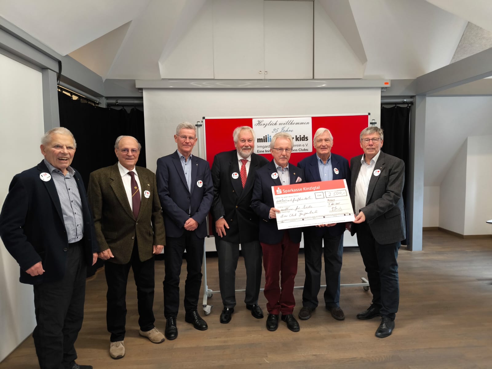Die Lionsfreunde, von links, Gerhard Wedler, Walter Bodmer und Gerhard Gütle zusammen mit Georg Benz, Vorsitzender des Fördervereins des Lions Club Gengenbach, übergeben einen Spendenscheck in Höhe von 2500 Euro an den Vorstand von millions for kids, Gottfried Liewald, Dr. Ulrich Freund und Thomas Laubenstein. Aus der Idee des Garagenprojektes in Lahr ist ein sehr erfolgreiches Sozialprogramm für aus dem gesellschaftlichen Gleis geratene Jugendliche geworden. Das 25 jährige Jubiläum vom wurde am 9. November 2025 im Beisein von 40 Gästen gewürdigt. Zur Jubiläumsfeier von millions for kids mit Brunch, Grußansprachen und einer Ehrung gesellten sich neben dem Hausherr Bürgermeister Bernd Bruder aus Ohlsbach, Heiko Faller, Sozialdezernent des Ortenaukreises, Heike Barthruff, Sachgebietsleiterin im Ortenaukreis zusammen mit den Erziehern des Garagenprojektes, sowie Georg Benz vom Förderverein des Lions Club Gengenbach. Sozialdezernent Heiko Faller erinnerte an die vielfach anzutreffende Perspektivlosigkeit vieler Schüler. Von diesen jungen Menschen wird die Schule häufig als Ort der Last wahrgenommen. Hier setzt die Arbeit des Garagenprojektes ein, wo es gelingt, den jungen Menschen den Weg zurück in die Gesellschaft zu ebnen. Die anwesenden Erzieher des Garagenprojektes präsentierten zusammen mit Heike Barthruff einen Jugendlichen der zum Ausdruck brachte: „ Das Garagenprojekt hat mich nicht aufgegeben und in einer schweren Zeit aufgefangen“. Georg Benz vom Förderverein des Lions Club Gengenbach betonte, daß das Garagenprojekt eine wunderschöne Einrichtung ist, die es wert ist, fortgeführt zu werden. Mit einem Spendenscheck in Höhe von 2500 Euro erfreute er den Vorstand von millions for kids. Vom Lions Club Gengenbach zählten auch der leider verstorbene Emil Zöller und Bernd Lusch zu den Gründungsmitgliedern von millions for kids. Aufgrund seiner 13jährige Vorstandstätigkeit wurde Bernd Lusch von Thomas Laubenstein zum Ehrenvorsitzenden ernannt.